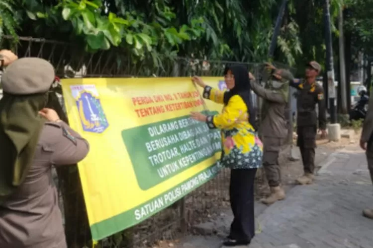 Edisi.co.id - Satpol PP Kecamatan Kalideres, Jakarta Barat memasang spanduk bertuliskan larangan berjualan di sepanjang Jalan Sumur Bor, RW 12, Kelurahan Kalideres.