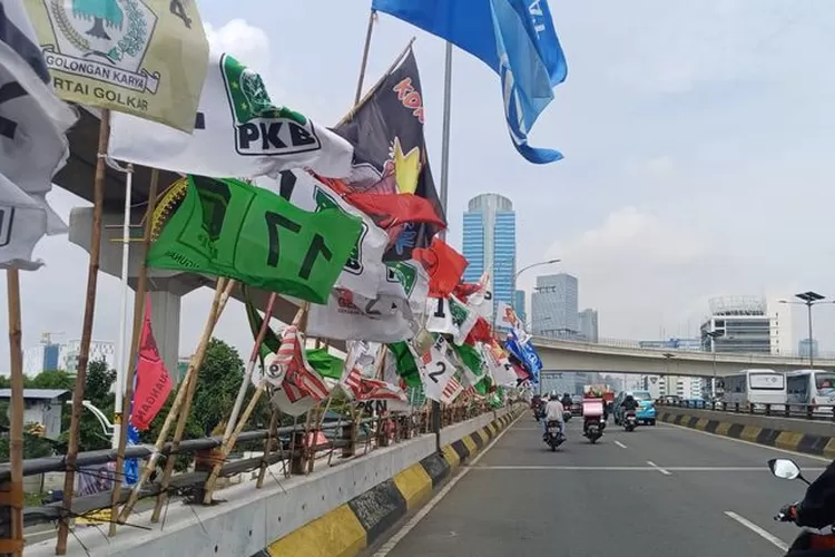 Pukul 15.00, selama pembatas flyover tersebut tetap banyak dipasang bendera parpol di sisi kiri dan kanan arah Semanggi. Setiap bendera terikat di kayu bambu, lantas kayu tersebut diikat bersama dengan kabel ties warna hitam.