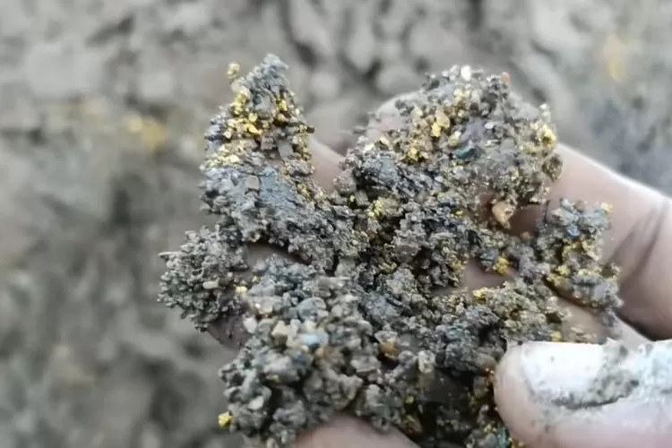 Di tengah gumpalan lumpur sisa banjir, tampak material berkilau yang diduga kuat sebagai butiran emas.