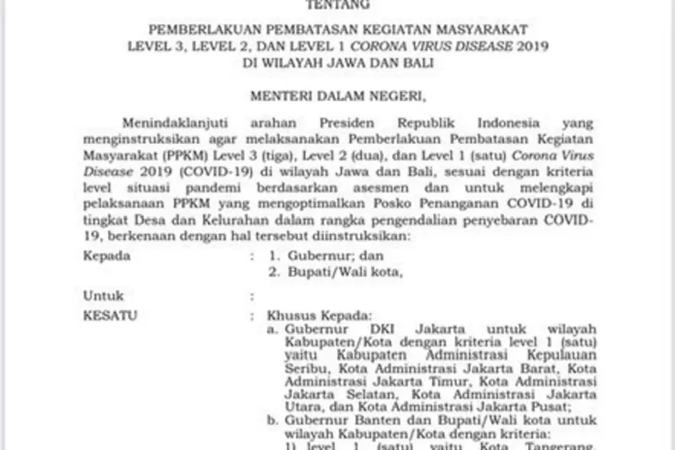 Dalam Inmendagri tersebut termasuk instruksi Presiden Republik Indonesia yang agar melaksanakan PPKM sesuai dengan kriteria level situasi pandemi berdasarkan asesmen. Dan juga untuk melengkapi pelaksanaan PPKM yang mengoptimalkan Posko Penanganan Covid- 19 di tingkat desa dan Kelurahan dalam rangka pengendalian penyebaran Covid-19.