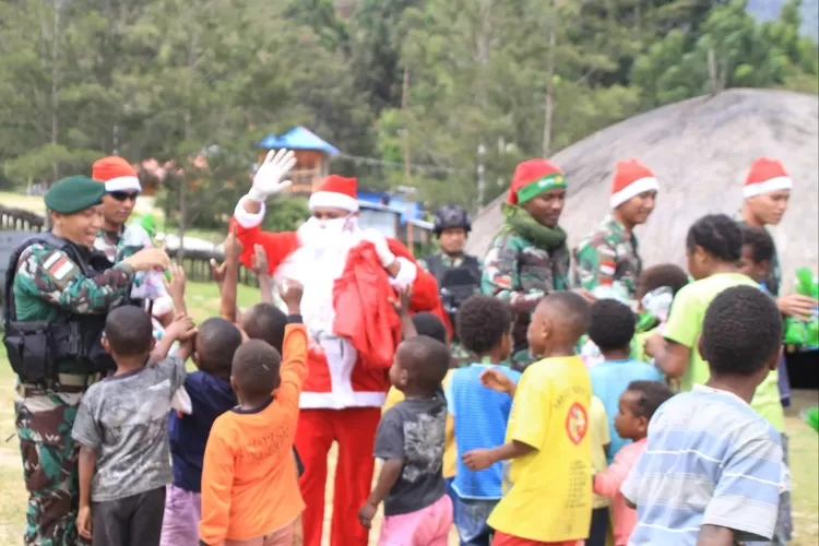 Edisi.co.id - Sinterklas Satgas Yonif mekanis Raider 412 Kostrad berbagi Natal kepada anak-anak di wilayah pegunungan Tengah Kabupaten Lanny Jaya Pura, Minggu 26 Desember 2021.