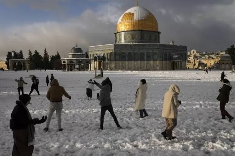 Pemandangan serbaputih juga terlihat di Masjid Al Aqsa, tempat suci ketiga bagi umat Islam, di Yerusalem Timur. Salju menutupi kompleks masjid sehingga dimanfaatkan oleh umat Islam untuk bermain.