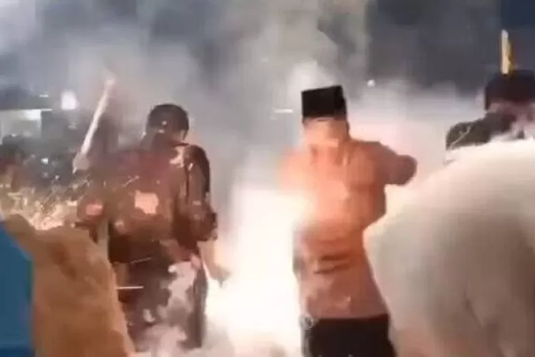Ada empat orang yang terlihat memegang kembang api tersebut, salah satunya Herlian yang berdiri di tengah.