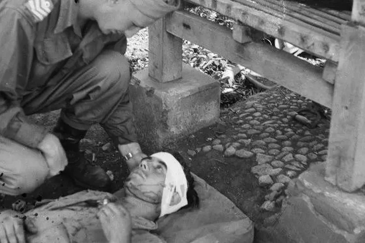 Edisi.co.id - Seorang serdadu Belanda berpangkat sersan mayor tengah menghibur salah satu prajuritnya yang terluka parah