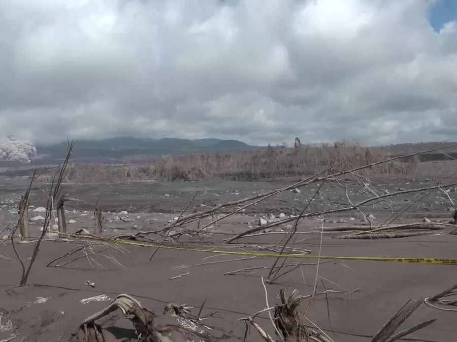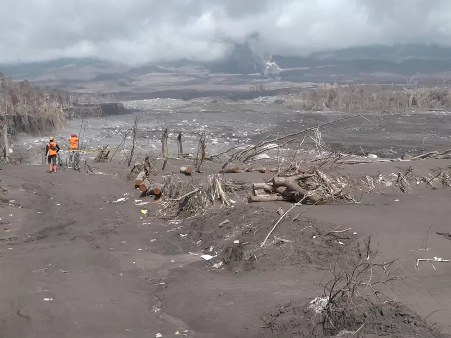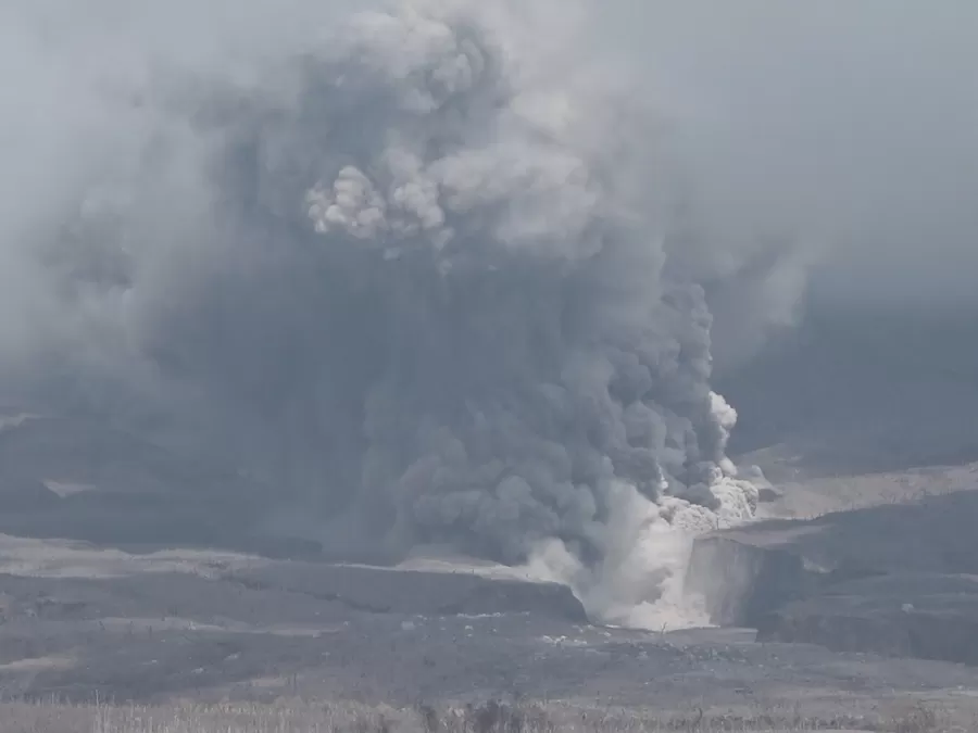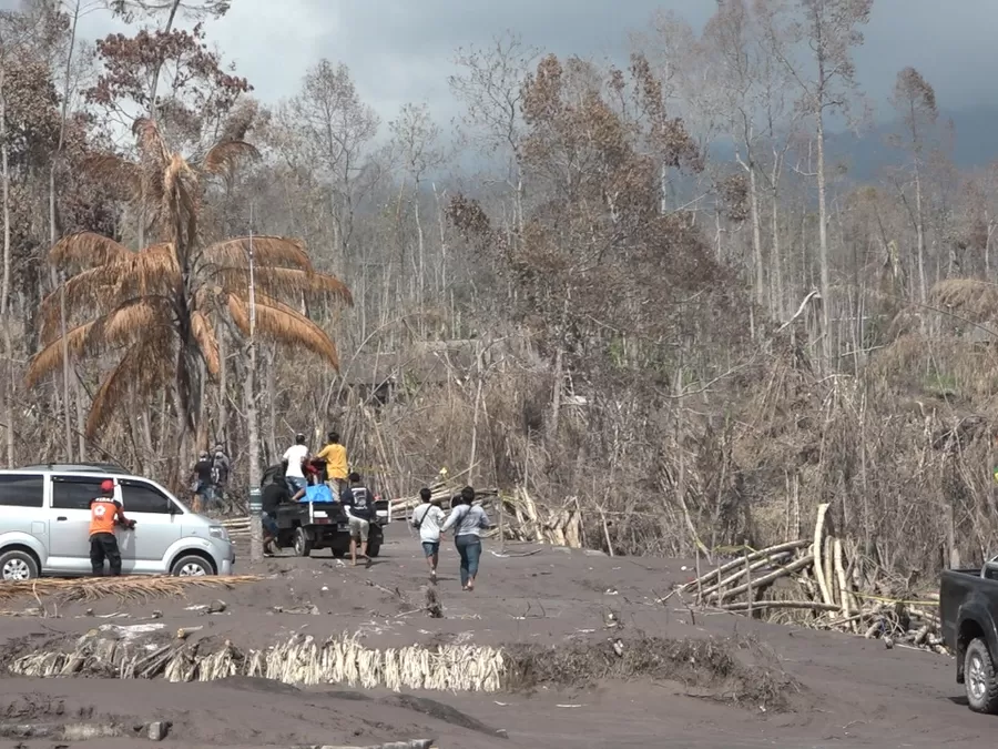 Abu vulkanik membumbung tinggi. Warga berbondong-bondong berlarian menuju ke lokasi yang lebih aman.
