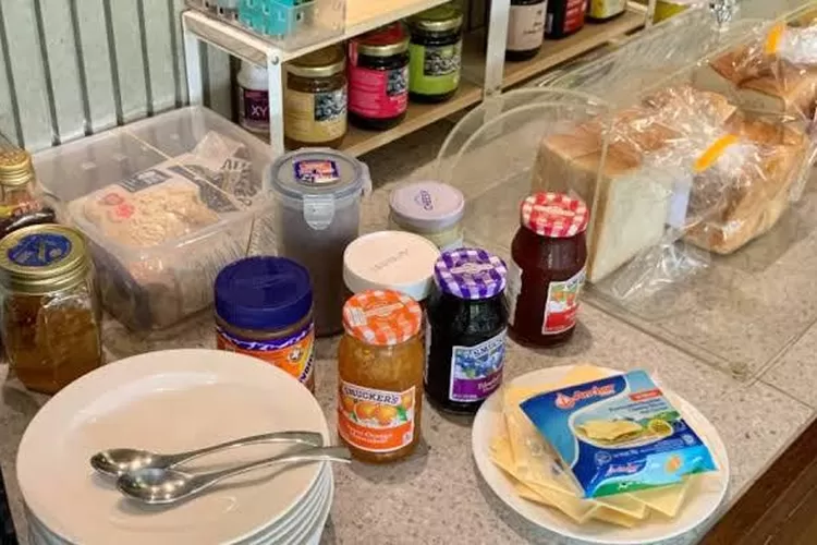 Terlihat di dalam keranjang tersebut terdapat beberapa bungkus roti, selai berbagai rasa, keju dan olesan telur. Selain itu, pantry juga menawarkan berbagai mesin teh, kopi, dan kopi.